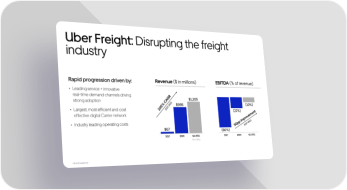 Uber Freight: Disrupting the freight industry EBITDA (% of revenue) Revenue ($ in millions) 2017 2020 Q1 2021 (10%) (22%) (60%) 50pp improvement 2017-2021 2017 2020 Q1 2021 $1,205 $995 $67 106% CAGR 2017-2021 Rapid progression driven by: Leading service + innovative real-time demand channels driving strong adoption Largest, most efficient and cost effective digital Carrier network Industry leading operating costs Run-Rate US and Canada only