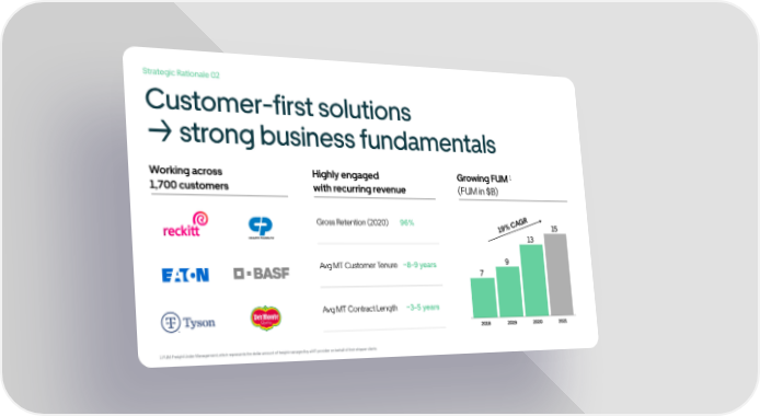 Strategic Rationale 02 Customer-first solutions strong business fundamentals Working across 1,700 customers 1. FUM: Freight Under Management, which represents the dollar amount of freight managed by a MT provider on behalf of their shipper clients Gross Retention (2020) 96% Avg MT Customer Tenure ~8-9 years Avg MT Contract Length ~3-5 years Highly engaged with recurring revenue Growing FUM 1 (FUM in $B) 2018 2019 2020 2021 15 13 9 7 19% CAGR