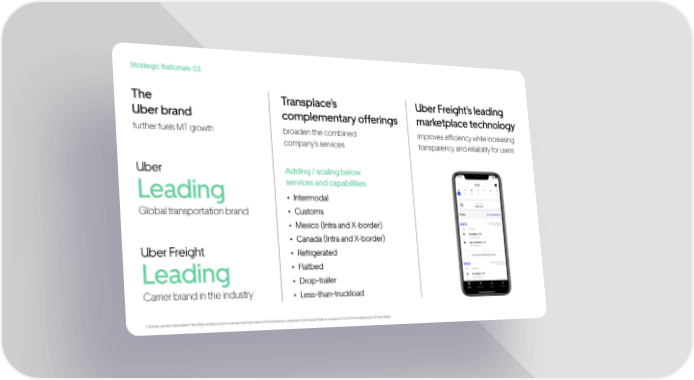 Strategic Rationale 03 Transplaces complementary offerings Uber Freights leading marketplace technology Leading Global transportation brand Uber Leading Carrier brand in the industry Uber Freight Adding / scaling below services and capabilities: Intermodal Customs Mexico (Intra and X-border) Canada (Intra and X-border) Refrigerated Flatbed Drop-trailer Less-than-truckload improves efficiency while increasing transparency and reliability for users broaden the combined companys services The Uber brand further fuels MT growth 1 1. Survey, carriers were asked "How likely would you be to use services from each of the following companies in the future? Rate on a scale of 0 to 10 (0=not likely at all, 10=very likely)