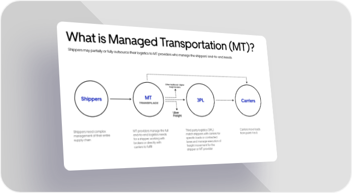 What is Managed Transportation (MT)? Shippers may partially or fully outsource their logistics to MT providers who manage the shippers end-to-end needs Shippers need complex management of their entire supply chain Shippers MT providers manage the full end-to-end logistics needs for a shipper, working with brokers or directly with carriers to fulfill MT Third party logistics (3PL) match shippers with carriers for specific loads or contracted lanes and manage execution of freight movement for the shipper or MT provider 3PL Carriers move loads from point A to B Carriers Other traditional / digital freight brokers Uber Freight