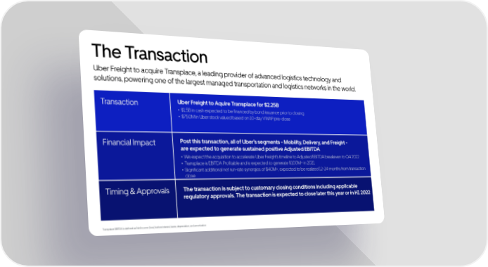 Uber Freight to acquire Transplace, a leading provider of advanced logistics technology and solutions, powering one of the largest managed transportation and logistics networks in the world. The Transaction Transaction Financial Impact Timing & Approvals Uber Freight to Aquire Transplace for $2.25B $1.5B in cash expected to be financed by bond issuance prior to closing $750M in Uber stock valued based on 10-day VWAP pre-close Post this transaction, all of Ubers segments - Mobility, Delivery, and Freight - are expected to generate sustained positive Adjusted EBITDA We expect the acquisition to accelerate Uber Freights timeline to Adjusted EBITDA breakeven to Q4 2022 Transplace is EBITDA Profitable and is expected to generate $100M+ in 2021 Significant additional net run-rate synergies of $40M+, expected to be realized 12-24 months from transaction close The transaction is subject to customary closing conditions including applicable regulatory approvals. The transaction is expected to close later this year or in H1 2022 Transplace EBITDA is defined as Net Income (loss) before interest, taxes, depreciation, and amortization
